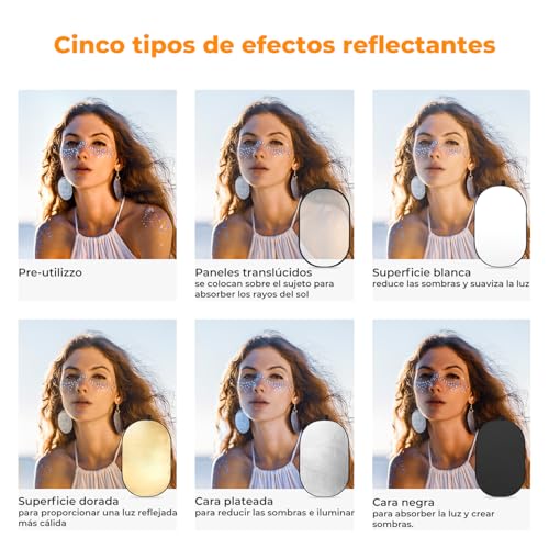 Reflector plegable multifuncional de fotografía】El reflector plegable de fotografía 5 en 1 tiene diferentes luces que se pueden aplicar a diferentes escenas. Dorado: refleja la luz con baja temperatura de color para restaurar el tono de la piel; Plateado: refleja la luz con alta temperatura de color para corregir el tono de la piel; Blanco: no tiene efecto sobre la temperatura de color; Negro: bloquea y absorbe el exceso de luz; Translúcido: actúa como difusor. El reflector de fotografía es el accesorio fotográfico perfecto.