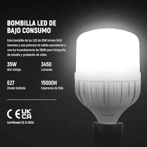 Bombilla LED de 35W y 5700K: Esta bombilla LED de 35W tiene una potencia de salida equivalente a una luz incandescente de 350W y aporta 3450 lúmenes para fotografía de estudio y grabación de vídeo. Atorníllala a un socket E27 estándar para obtener una iluminación brillante y constante sin parpadeos.