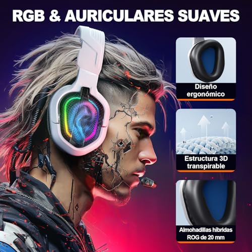PG2 Auriculares Gaming para PS4, PS5, PC, Xbox, Nintendo Switch, Cascos Gaming con Sonido de Micrófono Estéreo IA, Cascos con Conector de 3.5 mm y luz RGB, Blanco/Azul