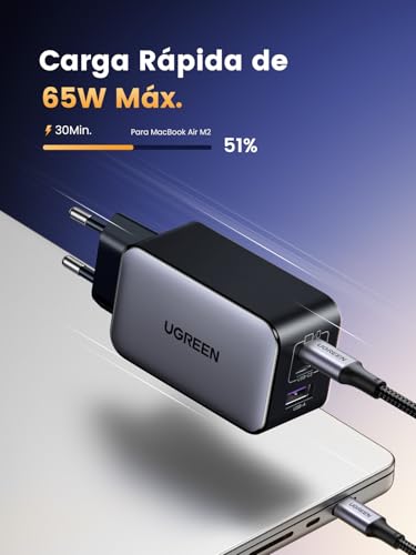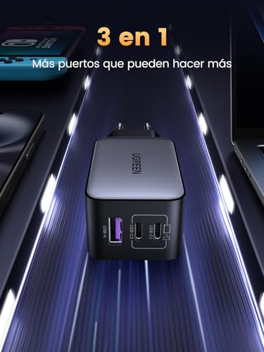 UGREEN Nexode 65W USB C GAN Tech Cargador 3 Puertos, Adaptador de Corriente USB C Compatible con MacBook Air, iPhone 16/15/14/13, iPad, Samsung Galaxy S24/ S23/ S22, Google Pixel 7 Pro Negro