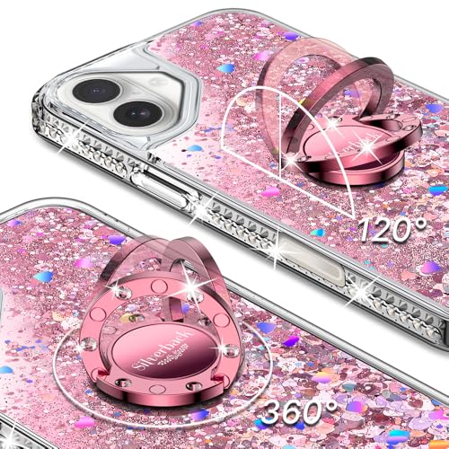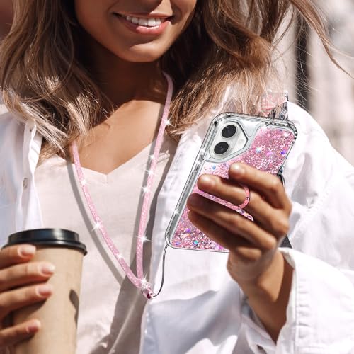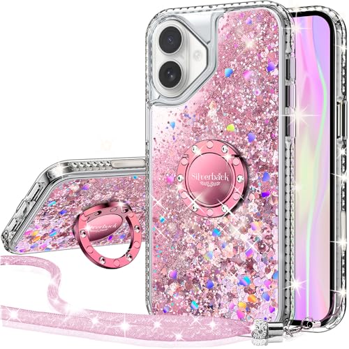 Silverback Funda para iPhone 16 con Correa, Chicas y Mujeres Funda con Purpurina para teléfono móvil con Soporte para Anillo Funda Protectora para iPhone 16 6.1» – Rosa