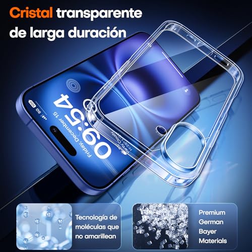 [Transparente como el cristal y no amarillea] La funda protectora transparente para iPhone 16 utiliza material de TPU ultratransparente alemán Bayer para restaurar la belleza original del teléfono. El material de nanorrecubrimiento antioxidante de alta calidad es eficaz contra la suciedad y el sudor, evitando que la funda del teléfono se dañe, volviéndose amarillo