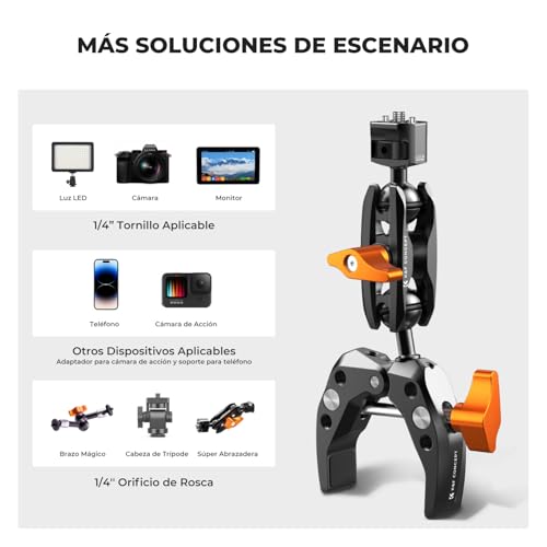 【Material Prime】Hecho de aleación de aluminio y acero inoxidable, resistente y duradero. El paquete incluye: 1 x super clamp, 1 x brazo mágico, 1 x clip de teléfono, 1 x adaptador de cámaras de acción.