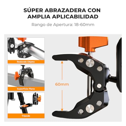 【Amplia Applicaciones de Uso】Viene con una super abrazadera y un Brazo Mágico con carga máxima es de 3kg. Super clamp pinza tiene una abertura de 60mm, se puede sujetar fácilmente en cualquier lugar, como barandillas, tableros de mesa, tripodes,ramas y mucho más.