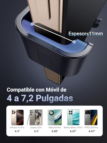 [ Material de Alta Calidad] Este soporte móvil coche hecho de aleación de aluminio mate y bien oxidada. Está en hermosa armonía con el interior del automóvil. Las almohadillas de silicona gruesas en los clips del soporte continúan garantizando un ajuste estable del teléfono celular sin deslizarse. Nota: No se recomienda utilizar fundas gruesas para móviles, el soporte es compatible con espesores de hasta 11mm.